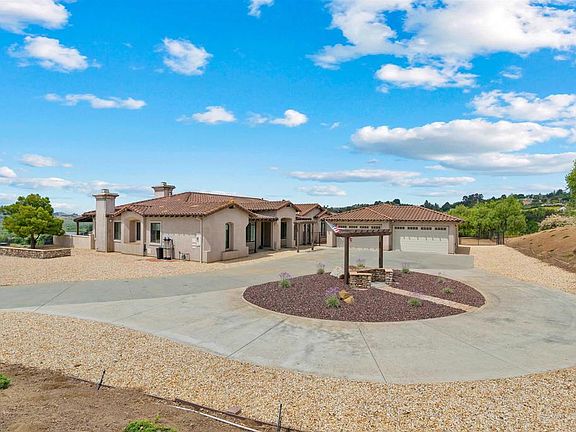 Exquisite single-story Fallbrook estate located in the coveted Golf Community of Sycamore Ranch! This prestigious neighborhood offers an 18-hole course at the Golf Club of California - membership available but not required. No HOA or Mello Roos. Situated on an elevated 1.99-acre lot overlooking a peaceful horse ranch & the hills of Bonsall, providing 270° views of sweeping vistas. No expense was spared in the owner-selected custom upgrades: new water purification system, dual-pane windows, plantation shutters, roller shades, new AC & HVAC. Detached 1 BR, 1 BA casita w/ efficiency kitchen, sink & microwave. 4 car garage w/ epoxy floors & 220v, 40 AMP electric car charging station. All BAs remodeled w/ glass-enclosed, high-end custom-tiled walk-in showers & quartz counters. A long circular drive enhances the home’s grandeur. The dramatic double-door entry welcomes you inside w/ upgraded laminate flooring & 10ft ceilings, accentuating the open layout. Arched cased openings define the formal dining room & adjacent living room. Gourmet kitchen equipped w/ quartz counters, large island, custom lighting, high-end SS appliances, walk-in pantry & breakfast nook. The family room, accented by a stacked stone Travertine fireplace, offers an inviting space for relaxation & entertainment. Large sliding doors provide a seamless transition to the resort-style patio, extending the comforts of the interior outdoors for unparalleled alfresco living. Lavish primary suite features a fireplace, glass sliders & luxurious BA w/ soaking tub, walk-in shower, custom cabinetry & large walk-in closet. There are 3 guest BR plus a versatile bonus room w/ glass sliders - perfect home office or optional BR. The flat, usable grounds offer ample space for expansion & plumbing for a pool. Welcome home!