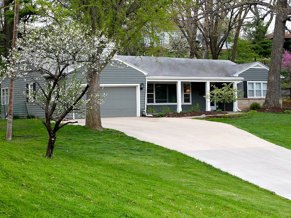 South of Grand ranch home with open floor plan, picturesque setting. Beautifully remodeled kitchen with white cabinetry, stainless steel appliances and sleek concrete counters. Spacious, sun-filled living room with wood burning fireplace and open to dining room. Master bedroom with bath, 2 additional bedrooms and full bath. Main floor laundry. Wonderful outdoor living spaces --- cozy front porch, private back yard. Many updates, move-in condition.