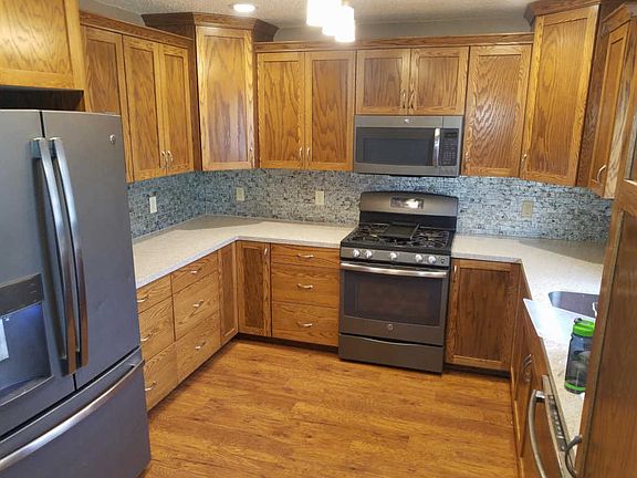 Well maintained, updated, and move-in ready split on corner lot with easy access to Hwys 14, 57 & 34. Open concept between kitchen and dining room, both with laminate floors. Kitchen has stainless steel appliances, tiled back splash, and lots of storage. Two bedrooms and a full bath with tile floor round out the main floor. Basement includes beautifully remodeled family room with built-ins, lower level master with walk-in closet, 3/4 bath with walk-in shower, & laundry room. Fenced back yard with deck & patio for entertaining.