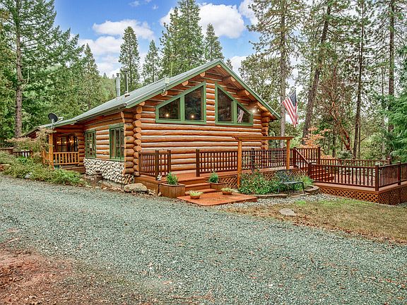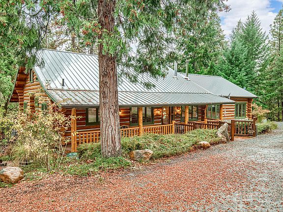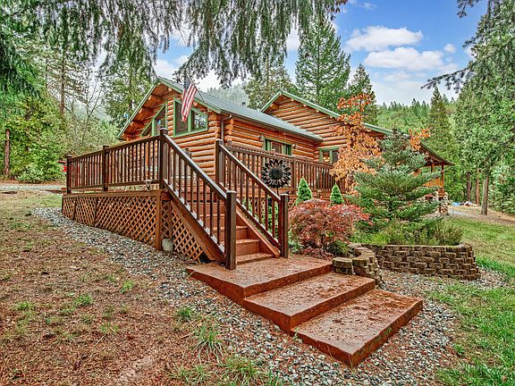 Gorgeous custom log home on 5.05 private acres wi heated shop & guest apartment. The home features rock accents, hickory flooring, 2300 sq ft, 2 beds wi/loft as possible 3rd bedroom, 2 full baths, master on main level, open floor plan, huge living room wi vaulted ceilings & pellet stove, family room wi wood stove, nice kitchen with double ovens. Some nice recent upgrades include new 5 ton heat pump w/smart thermostat, new ducting, new staircase & bath remodel. The home is framed by a water feature & beautiful decks on front & back with custom metal railing. The guest apartment is 500 sq ft with mini-split system, laundry & full bath. Fabulous insulated, heated shop in 2 sections, 56 x 30 & 33 x 24 with half bath & two 220 panels & plumbed for air compressor. Exterior features also include cov'd RV pkg (24'w x 30'd), carport (12 x 17), wood & garden sheds, great well wi/newer pump, strawberries, blueberries, fenced yard, circular drive & gated entry! Live the Oregon Dream!