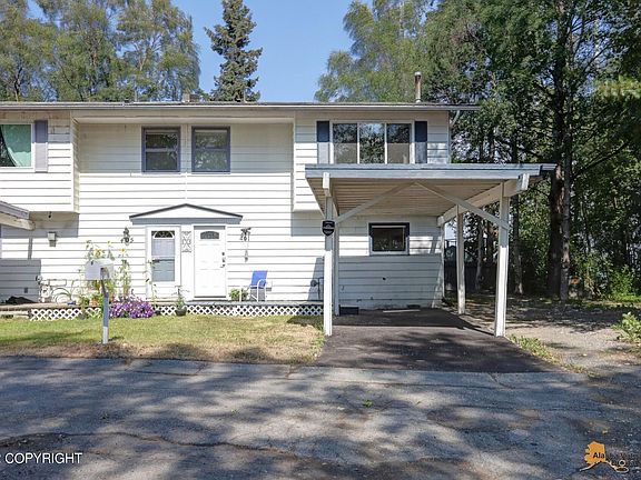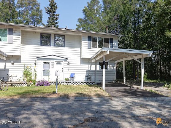 This town home has no HOA or, dues and sits right in midtown Anchorage. End unit offers privacy with a wooded area and tons of parking. New asphalt for carport in 2022. Heating system has been serviced, cleaned and invoices available. Newly painted, newer windows in upper level, new door to back deck and a storage closet. Laminate flooring in lower level with an open kitchen. Three bedrooms andspacious full bath in upper level plus a deck for your enjoyment.