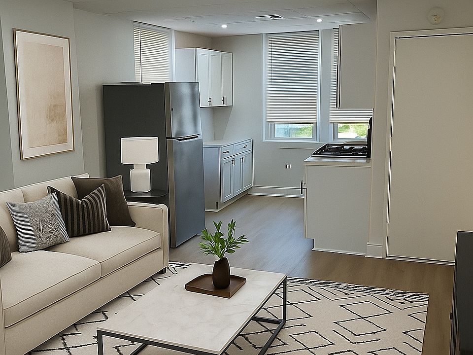 This modern 1-bedroom apartment offers a sleek and stylish living space with the added touch of stainless steel appliances in the kitchen. The open-concept design creates a seamless flow between the living area and the well-appointed kitchen, where gleaming stainless steel appliances enhance both functionality and aesthetics. The contemporary ambiance is further complemented by large windows that fill the space with natural light, creating an inviting atmosphere. The bedroom provides a comfortable retreat, and the overall design reflects a perfect blend of comfort and modern elegance, making this apartment an ideal urban dwelling.