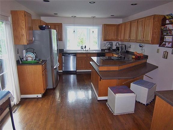 Charming and unique saltbox home is nestled on a private lot with great yard and view. Two story family room with walls of windows and log burning fireplace as a focal point make this a cozy and comfortable place to hang out or entertain. Expansive kitchen is fully equipped w/large corian seating island, and great counterspace. Adjoining eating area will accommodate a full dining set. Box bay window perfect for plants or herbs. Sought after first floor office, second floor laundry, master bedroom to hold your king sized furniture, and generously sized second and third bedrooms. Lower level will wow you with the space, and second half bath, where you can walk out to the back yard. Tiered deck is private--summer grilling or quiet time in the trees! Shed under the deck for lawn storage. Newer furnace, HWH, brand new driveway. Perfect north Peters location with quick access to I-79, Rt 19 or Giant Eagle Express. Near Woodland Hills Swim Club. School bus stop at the driveway!