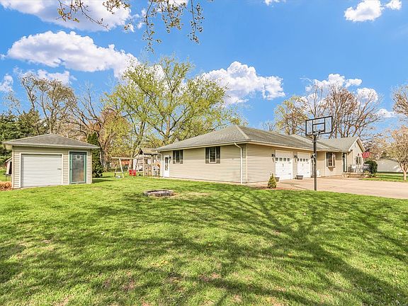 Spacious ranch style home featuring a beautifully remodeled primary bathroom. The standout garage is a true showpiece, climate controlled and complete with its own kitchenette, making it ideal for entertaining, hobbies, or gatherings. Prefer more parking? It can easily be converted back into a functional 3-4 car garage to suit your needs. Plus, an additional storage shed with a 1-car garage door offers even more versatility. Notables include: All new outlets and light switches, New kitchen can lights with night-light feature, Updated lighting fixtures including dining room chandelier, foyer light, garage entry light, kitchen table light, and new sconces in the family room,New ceiling fan in the family room. interior uprades include Fresh paint throughout every room, New cabinet hardware and two new toilet seats. Also painted shutters and both front doors, added stylish carriage-style hardware to the garage door, new house numbers on the front porch & mailbox added, now part of the Sadorus mail rout. Refrigerator (2021) Stove (2022) Microwave/hood range (2022) Washer (2022)Dryer (2020) Renovated master bathroom (2022) Nest thermostat for the house (2022) and garage (2021) Septic (2021)-in front of shed and has an alarm next to swingset. Camper hookup in the garage next to the bar. Another notable is that this is a golf cart community.