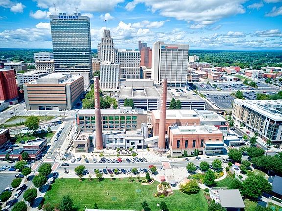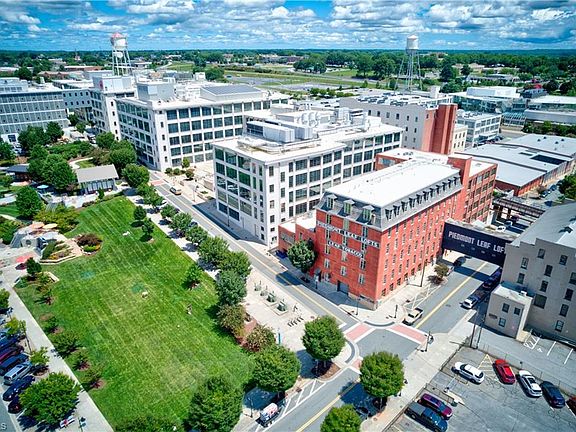 Rare opportunity to reside in the historic Piedmont Leaf Lofts! This fantastic loft is an end/corner unit with large windows providing an abundance of natural light, and great views of downtown and Bailey Park. Open floor plan with exposed brick, beams and columns, hardwood floors and ten-foot ceilings. The great room, well equipped kitchen with island, and dining area, flow nicely - ideal for entertaining. Primary bedroom has a large bath with a walk-in shower and a custom designed walk-in closet. Amenities include secured covered parking garage, storage room, fitness center and rooftop patio area. Exceptional location within walking distance to multiple cafés, restaurants, bars, Wake Forest Innovation Quarter, Bailey Park and the Long Branch Trail greenway. Historic designation reduces property tax bill.