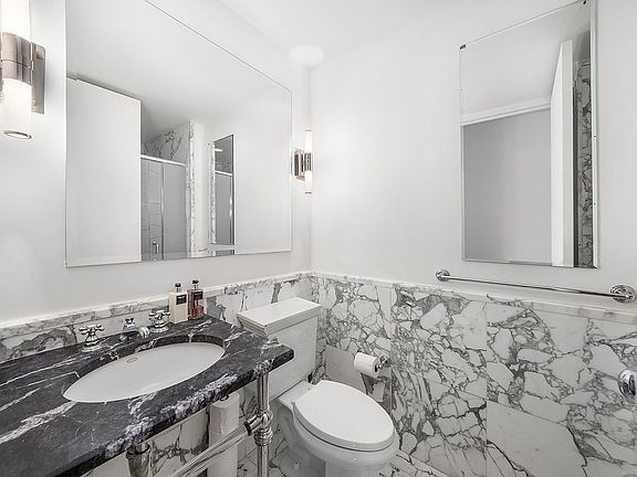 On the south side, a private bedroom suite glows with natural light from double southern and western exposures and includes its own en-suite bath. Across the home, the primary suite commands western views over Central Park and offers a walk-in closet, additional custom closets, and a spa bath with soaking tub, standing shower, double vanity, and built-ins. The third bathroom, finished in marble with a full standing shower, serves the main living area with elegance.