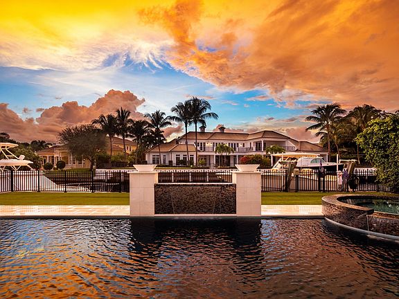 THE BEST WATERFRONT VALUE in the prestigious Royal Palm Yacht & Country Club. Featuring 95-feet of direct water frontage on the highly desirable street of East Coconut Palm Road, this two-story, 6,433-square-foot estate includes six bedrooms, seven full baths and one half bath. The elegant architectural treatment outside yields to a spacious interior that seamlessly bridges that worlds of comfort and sophistication. Interior highlights include front and rear staircases, a sprawling library/office with dramatic built-in shelving and wet bar, a two-story formal living room, and a relaxing family room with beamed ceilings and towering windows that invite natural light. In addition, an upstairs theater room boasts stadium seating and a bar area. This brand new gourmet kitchen includes state-of