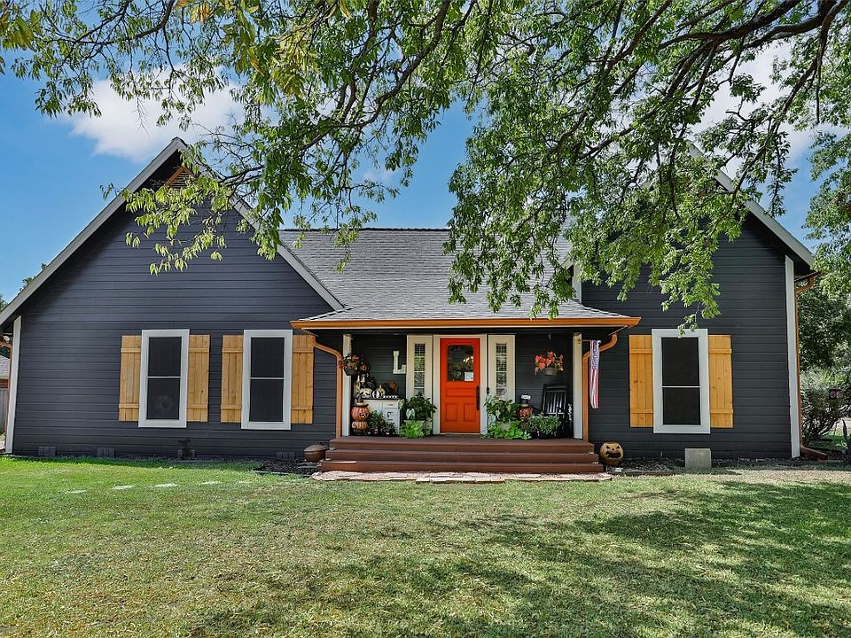 A cheerful pop of color greets you as you approach the front door – a bright orange entrance.