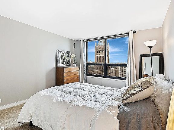 The separate sleeping area includes a second oversized walk-in closet. Enjoy stunning bay window views of the city skyline and a glimpse of the lakefront!