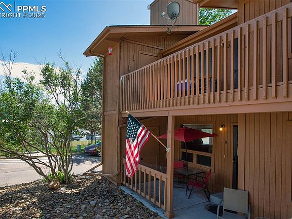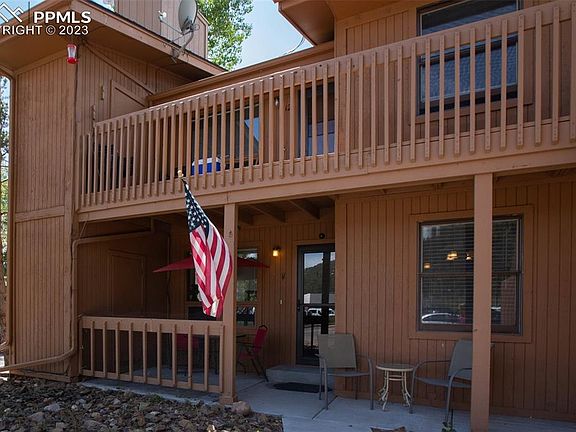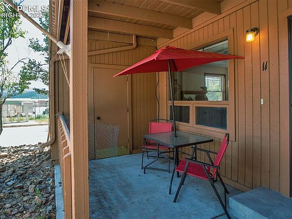 Tastefully updated mountain condo, end unit, bottom floor, with views of Pikes Peak. Covered front concrete patio, private coffee nook. New luxury vinyl flooring throughout, fresh interior paint, updated and upgraded custom kitchen with WilsonArt countertops, center island w/ counter-bar seating and pendant lighting above. Living area and kitchen have been opened up and made into a great room, adjacent the dining area. Living space offers a masonry wood-burning fireplace with a custom log mantle, and views to the South of Pikes Peak. New hot water heater in 2021. New stackable washer and dryer unit, plus a new dishwasher. 2 comfortable bedrooms and 2 baths in this home. Master bath has been updated with a larger walk-in shower, ceramic tile floors, newer vanity, lighting and commode. Full hall bath has also upgraded with new lighting, and tile flooring and vanity in addition to a new commode. This home is in a super location, quick access to the nearby Aquatics Center, Memorial Park, elementary and high school, shopping and nearby coffee shops just a few blocks away! Monthly HOA includes trash, water and sewer. Also, a single car garage is assigned additionally!