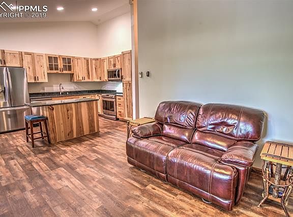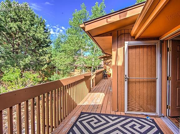 Conveniently located, and completely updated condo in Woodland Park. Upper level unit with views of Pikes Peak! Unit has been upgraded with brand new rustic Hickory kitchen cabinets, including pull out shelving pantry closet, slab granite countertops, new sink and fixtures, all new stainless steel appliances, w/ counter depth refrigerator. Open floor plan, vaulted ceilings in the great room with new kitchen island and counter-bar, overlooking living area which includes a corner wood-burning fireplace. Luxury, vinyl plank flooring throughout, new paint, new lighting, new hall bath vanity and toilet with tub shower.New stackable washer and dryer unit included. Master includes double wall closets, vaulted ceilings, new ceiling fan, attached ? bath, new log vanity w/ vessel sink new flooring, toilet, and shower. 2nd bedroom has an attached walk-in closet. Home includes all new top down, bottom up, cellulose window blinds. This is a truly upgraded unit, with a great floor plan, and also includes a single car garage as well! Wonderful in town opportunity!