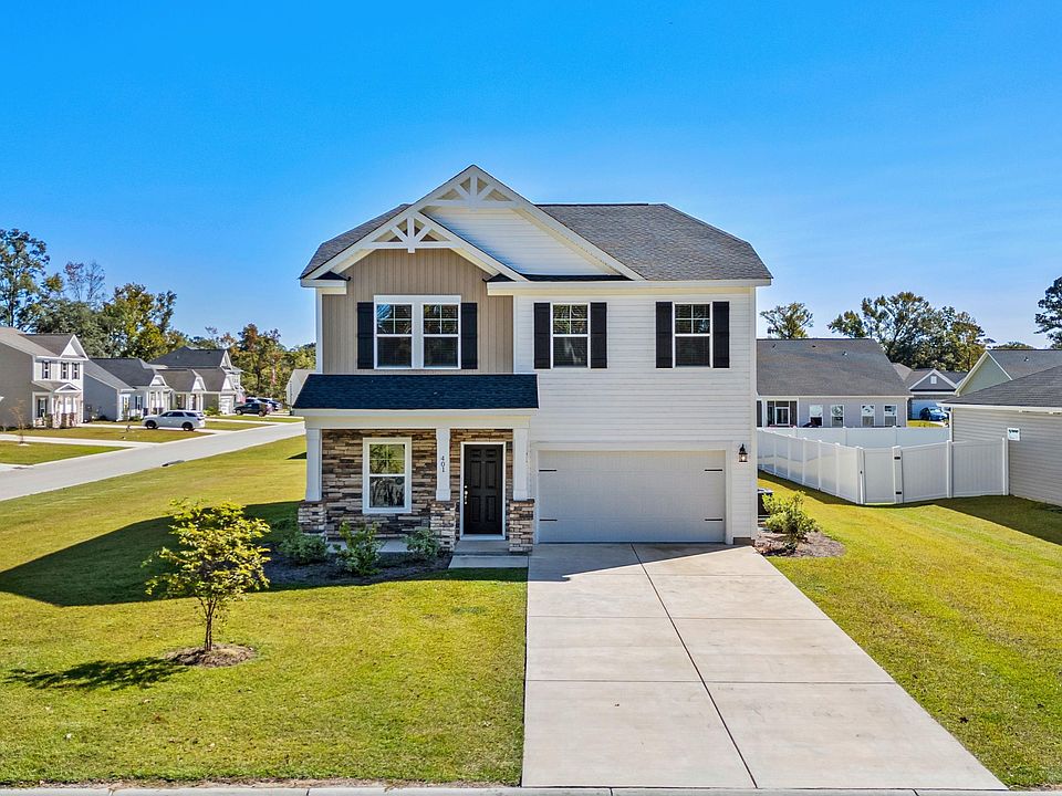 "Welcome to 401 Honey Hill, a beautifully designed 5-bedroom, 3-bathroom, two-story home, perfectly situated on a spacious corner lot in the highly sought-after Grissett Landing. This home offers the perfect blend of modern comfort and practical functionality, making it ideal for families and those who love to entertain. The first floor features a bright, open-concept layout, seamlessly connecting the living room, dining area, and kitchen. The kitchen is a chef’s dream, equipped with stunning granite countertops, stainless steel appliances, a large island with seating, and plenty of cabinet space for all your storage needs. On the first floor, you'll also find a full bathroom and a versatile room that can serve as a fifth bedroom or a private office, offering flexible living options for guests or working from home. This thoughtful layout provides both convenience and privacy, making the first floor perfect for multi-generational living or accommodating visitors. Upstairs, the luxurious primary suite awaits, complete with a large walk-in closet, a spacious tiled shower, and a separate garden tub, offering a relaxing retreat at the end of the day. The additional bedrooms are generously sized and share two beautifully designed bathrooms, ensuring plenty of space and comfort for everyone in the household. The exterior of this home is just as impressive, with a large yard that provides endless possibilities for outdoor activities, gardening, or future landscaping projects. The home’s corner lot location offers added privacy and space, making it perfect for family gatherings or simply enjoying the outdoors. Plus, the neighborhood offers exclusive access to the scenic Waccamaw River, where you can enjoy kayaking, fishing, or picnicking by the water, a true haven for outdoor enthusiasts. Located just minutes from historic downtown Conway, this home is close to top-rated schools, shopping, dining, and entertainment, while still offering a peaceful, suburban atmosphere. It’s also a short drive to the beautiful beaches of Myrtle Beach, giving you the best of both worlds. With its spacious layout, modern finishes, and prime location, 401 Honey Hill is a move-in ready gem in one of Conway’s most desirable communities. Don’t miss your chance to make this stunning home your own!"