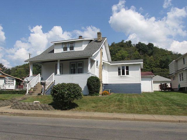 Corner lot across from Wheeling Creek. Updated 1.5 story with first floor bedroom and bath. Oak kitchen. 2 large bedrooms up stairs. Full basement. Central air. 2 car detached garage and more.