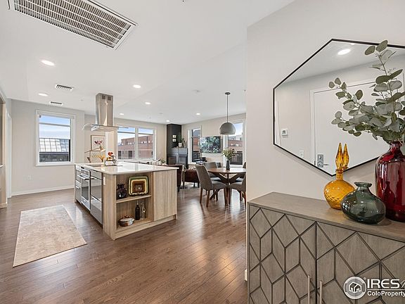 Discover the perfect blend of luxury and lifestyle in this exclusive southwest-corner condo at Confluence with sweeping views of the front range mountains. Offering 2 bedrooms, 2.5 bathrooms, and a premium parking space in the secure garage and elevator access. This open, light-filled design showcases hardwood floors, quartz countertops with a dramatic waterfall edge, stainless-steel appliances, automatic window shades, and high-end finishes throughout. The primary suite impresses with warm wood ceilings, custom walk-in closet, and a spacious bath with dual vanity. A second bedroom, set apart for added privacy features its own bath and a custom closet. Thoughtful upgrades continue with a well-appointed, custom laundry room, complete with built-in storage and a pantry. A private patio extends the living space with views of the front range and the plaza-perfect for morning coffee or evening sunsets. Confluence residents enjoy unmatched amenities: a rooftop patio with panoramic views, firepit lounge, secure entry, underground parking, private storage, dog wash, and bike storage, with additional owner parking nearby. Step outside and embrace the vibrant River District lifestyle, unwind at Woodhouse Spa, sample local breweries and restaurants, or ride along the Poudre River Trail. This is Fort Collins living at its finest-modern, convenient, and truly unforgettable. Selling as Turnkey is possible. Additional Reserve Parking spaces for Confluence owners nearby. Owner is a licensed Realtor in Colorado.