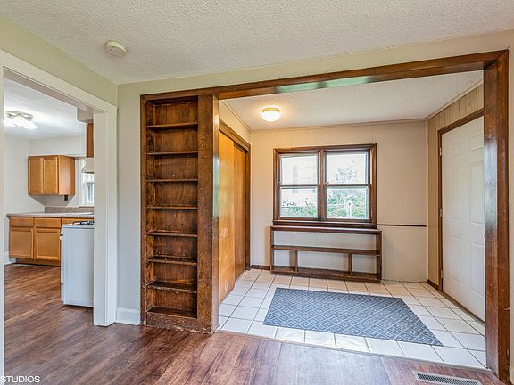 - Description: The tiled foyer welcomes you into the living room. Note the shelving on the wall, the large front window and nice flooring.