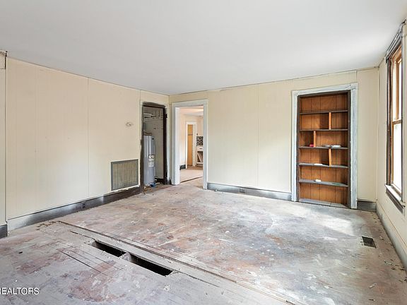 Inside, you'll find a large living room with a built-in bookcase and an eye-catching brick fireplace—a stunning centerpiece for aesthetics, though functionality is yet to be confirmed. The spacious kitchen offers plenty of room for meal prep, gatherings, and creative design opportunities.