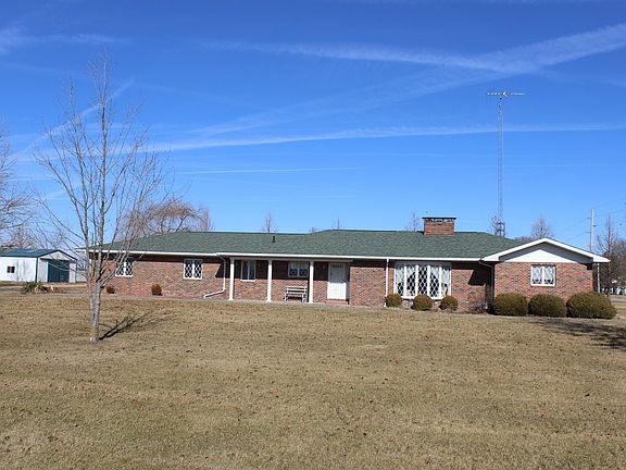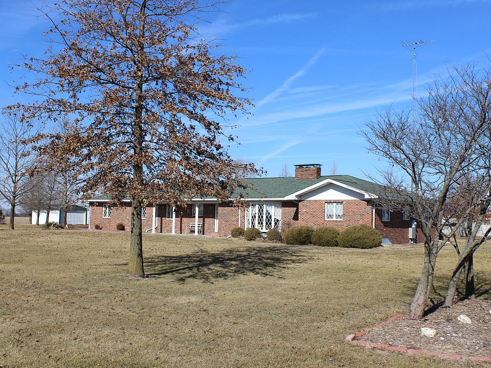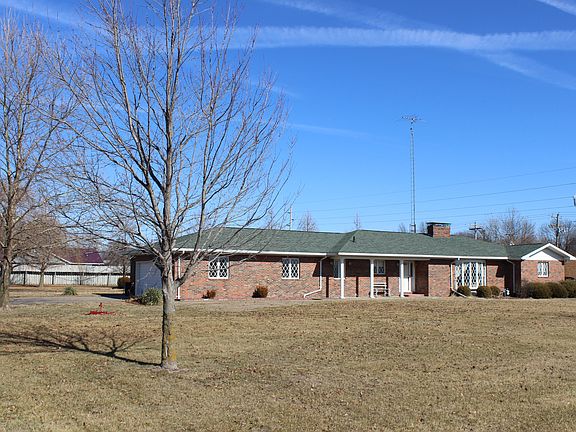 PRICE REDUCED on this Country home that sides the city limits and farm land! Brick ranch style home offering approximately 2,160 sq. ft. of main level living space. Features an open entry with coat closet, living room with fireplace and bay window, open dining room and family room with fireplace, kitchen, 2 bedrooms, 2 baths, utility area with washer & dryer and a wide stairway to basement plus an elevator. Kitchen includes appliances plus a fold out wall pantry. Full basement offers a family room with wood burning fireplace, pool table and showcase wall storage. Open kitchen and dining area. Bedroom with full bath + hallway walk-in closet. Utility area with furnace and hot water heater. Under stairway closet + 2 hallway closets. Storage room under garage. Hot water heat. Central air. Ceiling fans. Attached 2-car garage with door opener. Covered front porch. Covered patio. Gazebo. Outbuildings include a 30’ x 54’ metal building + an 11’ x 29’5 extension and an 18’ x 25’ metal building.