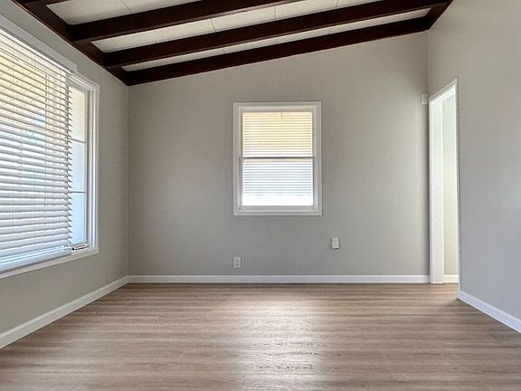 MORE PICTURES COMING SOON! 1400 sq. ft. Three bedroom, two bath corner lot property. Large open kitchen/Dinning with Formica counter tops, white range, fridge and hood vent. stainless steel dishwasher and luxury laminate flooring. Living room has vaulted ceilings with wood beams and lots of windows. Luxury laminate flooring throughout, and carpet in two bedrooms. Bedrooms also have vaulted wood beam ceilings. There are 2 full bathrooms,1st bathroom has a linen cabinet and washer/dryer hook-ups. Large xeriscape backyard. Evaporative cooling and forced air heating. refrigerator provided but not warrantied.