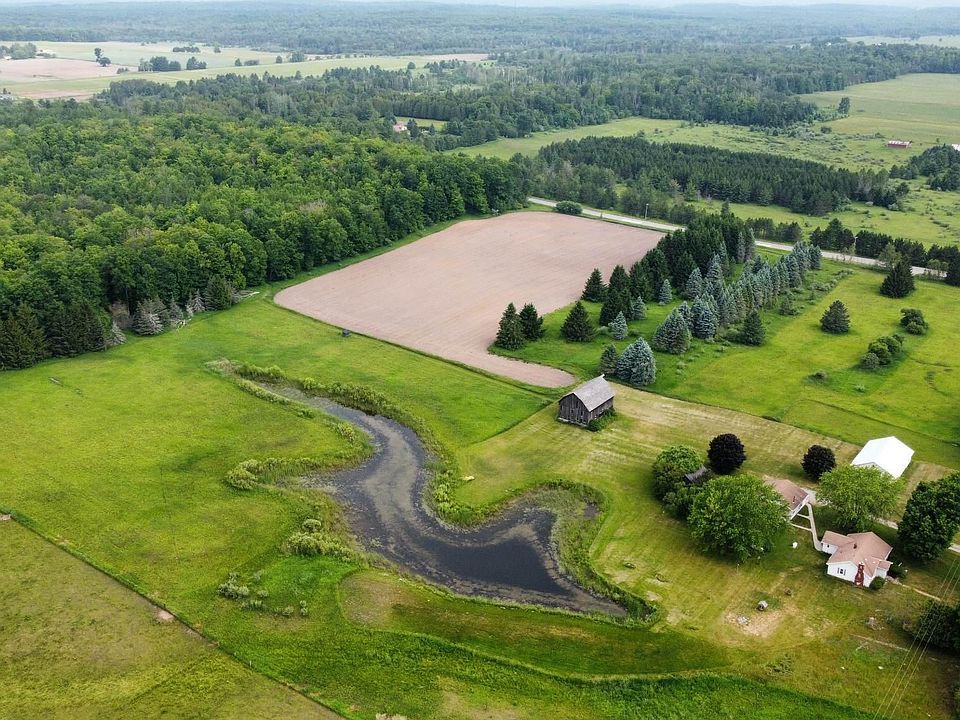 Absolutely amazing 80 Acre property w a large pond. 3 bedroom all with large closets. 1 bath home on a basement. Generac whole house generator. 32x34 detatched garage with woodshop quarters in the back. large 36x60 pole barn to the north of the house. To the west of house is a old grainary barn, also to the west is a large older barn. The property is apprx 50/50 split of woods and field, currently a local farmer is growing hay, he will have the right to remove his hay when its ready. This property is prime location for wildlife.