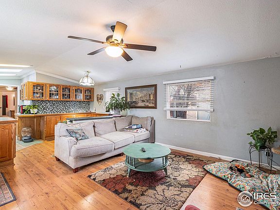 Come see this well maintained 3 bed/2 bath mobile home in North Fort Collins with easy access to I-25 and Hwy 14 and close to public transit. Park is pet friendly and includes a pool and clubhouse. Inside you will find full drywall throughout, central air, nice laminate floors in the living area, newer carpet in the two front bedrooms, new skylight in second bath, lots of natural sunlight, an open layout between the living area and kitchen, tons of cabinet and counter space, ceiling fans in all rooms, all appliances included! Primary bedroom has a large closet. Outside is a large front deck to access your fully fenced yard that includes a storage shed. HVAC has been serviced regularly. Security cameras around home will stay and work on DVR system. Home is being sold "As Is"