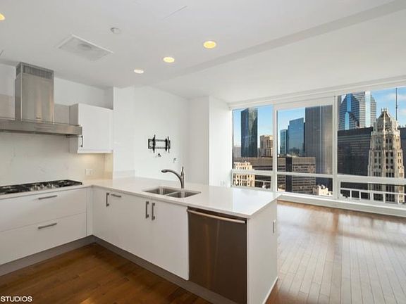 Immaculately designed, graciously appointed one-bedroom condo with Great River & Lake views. The kitchen has been updated with white cabinets and quartz counters. Unit features floor-to-ceiling windows and in-unit laundry. The large bedroom has an organized walk-in closet with a master bath with a deep soaking tub. All within walking distance to the best Chicago offers, from the exclusive shops on Michigan Ave to Chicago's historic sites along the Riverwalk. Rent includes gas, air, basic cable and water. Parking is available from another owner for $250/mo. Other one bedroom options are also available. Looking for an 18-month lease or longer. All apps are to be run by @properties for any resident over the age of 18. Tenant pays Building Move-in Fee of $1,000, Building Damage Deposit of $1,000 to HOA and again upon move-out, plus a one-time $1,200 processing fee. Smoking allowed:No
