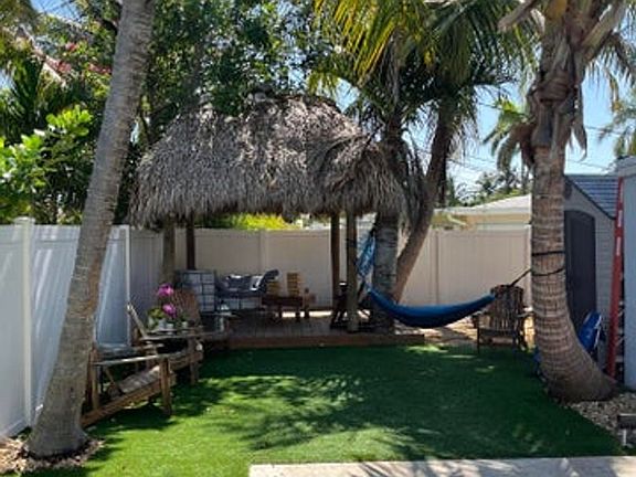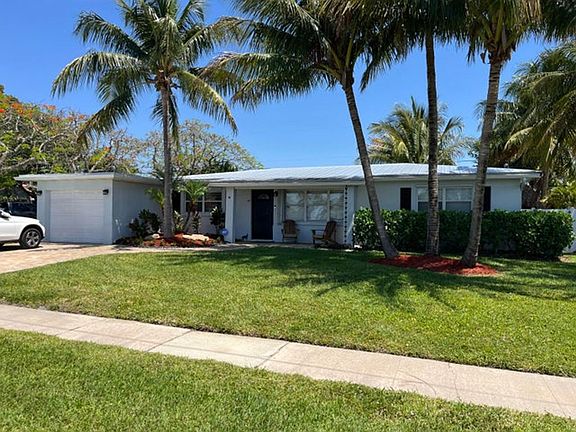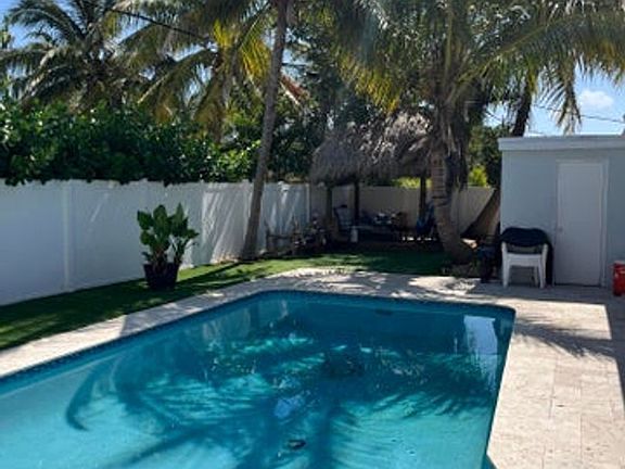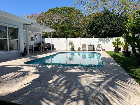 Courtesy of Re/Max Direct Beautiful 4 bedroom, 2 bath pool home with 1 car garage on oversized corner lot in East Boca Raton. Owner pays for pool & lawn service. Bike or walk to the Boca beaches. 1719 square feet with new tile throughout, updated bathrooms and kitchen with granite counters and stainless-steel appliances. Brand new travertine paver pool/patio with turf grass and a tiki hut. Tropical, mature landscaping surrounds this property. White PVC fence around entire back yard. Laundry room features cabinet storage, granite counters, front loading washer & dryer and additional refrigerator. Pets allowed but restrictions apply. Great house in a wonderful East Boca neighborhood.