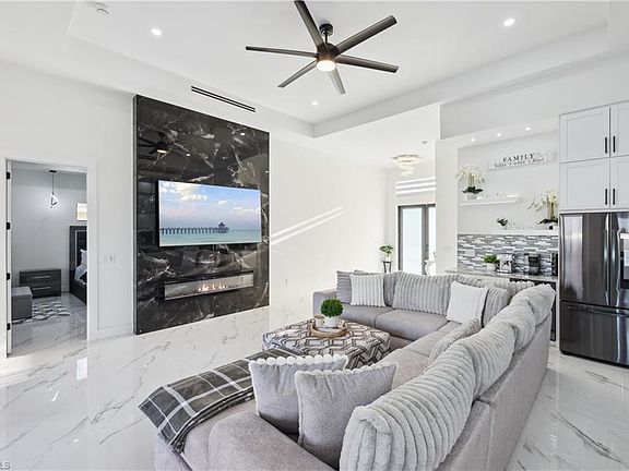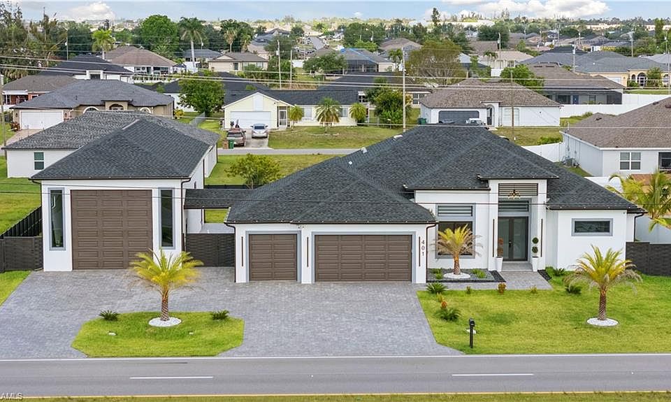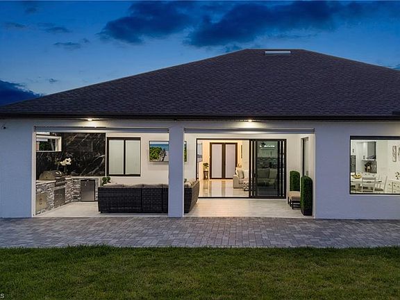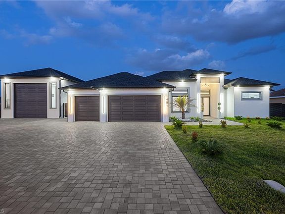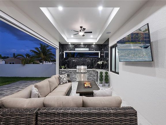 2023 built, like-NEW construction in Cape Coral! No detail has been missed in this open concept layout with porcelain tile floors throughout and quartz countertops in the kitchen and baths. 12' ceilings across most of the main living areas. Gourmet kitchen features sensational floating ceiling, large center island, stainless steel appliances, tons of cabinet space, tile backsplash and stainless pull-down faucet. Grand family room with a 13' coffered ceiling and cozy electric fireplace with floor to ceiling porcelain wall. 10' ceilings throughout the bedrooms and baths, 8' interior doors and impact resistant windows and doors. Luxurious master bedroom with 11' coffered ceiling, a pair of deep walk-in closets and dreamy master bath with his and her sinks, free-standing soaking tub and stunning walk-around shower with 2 rainfall shower heads. 3 additional bedrooms all with easy bathroom access. Sliding doors walk out to the lanai and backyard. Relaxing south facing lanai offers generous room for patio set and/or outdoor table. Fully loaded outdoor kitchen with built-in grill and sink. Relax with the roller shades down and the grill on! 3 car attached garage with epoxy floors. Endless room for all the toys and hobbies in the 23x60 detached RV/boat garage with additional full bath. Massive circular paver driveway. Fully fenced around the property. Plenty of room to add a pool on the .344 acres lot. Door to pool/guest bath with walk-in shower already! Conveniently located close to convenience stores, restaurants and parks. NO HOA!! NO FLOOD!! MOVE IN READY!! QUICK CLOSE POSSIBLE!!