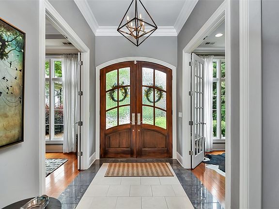 The home’s sophisticated design features an ideal flow where the kitchen with ample counter seating, family area, kitchen dining area, and living room seamlessly blend. The elegant foyer leads to a formal dining room and office, each adorned with French doors that enhance the home’s charming appeal. The home is hallmarked with high-end finishes throughout including stone surfaces, top-quality fixtures, multi-part moldings, arched doorways, tray ceilings, LED and ambient lighting, 8-foot solid core doors, and 10’ ceilings.