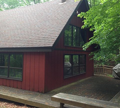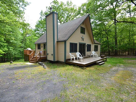 Lovely & well maintained 3 bedroom/2 bath home in the wonderful Pocono Mountain Lake Estates. Beautiful oak wood floors! Relax in living room with wood burning fireplace connected to dining area. Spacious eat-in kitchen with center island and cathedral ceilings. Nice updated master bedroom suite with high ceilings, full bath, & closet with laundry unit. Cozy bedroom, full bath & den with sliding doors lead to large wrap around deck, perfect for outdoor entertaining, w/ crawl space below. Open loft serves as an extra bedroom with door attic storage. Home has split A/C. Enjoy a piece of Pocono paradise in community that is private with easy accessibility to main roads, amenities and Pocono attractions. Call for showing today!