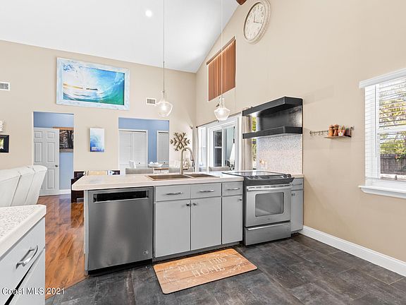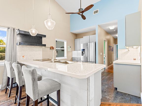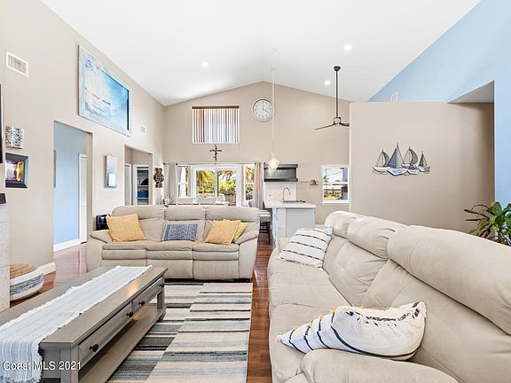 On a cul-de-sac between the Indian River & the beaches, this charming abode boasts a fully restored tile roof, a BRAND NEW HVAC system & modern updates! Stained concrete, wood laminate & tile floors sweep throughout. Vaulted ceilings soar over a fireplace great rm & open dining. The renovated b-fast bar kitchen exhibits SS appliances, pendant lighting, solid surface counters & a subway tile backsplash. Dual walk-ins & a chic bath hallmark the owner's retreat. The ensuite flaunts a pebbled & mosaic-tiled shower w/bench seating & a countertop basin vanity. The 2nd bath is cool & contemporary w/a twin sink vanity & classy tub/shower combo. Separated by a pocket door, 2 of the extra bdrms could be expanded into one. The vibrant backyard celebrates an open-air patio & pergola!