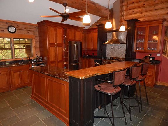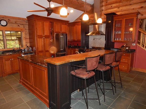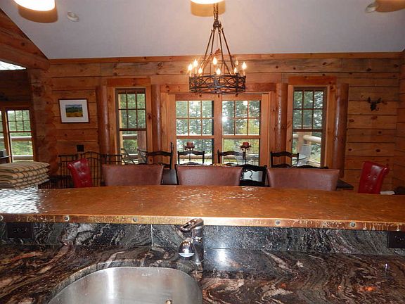 UPSCALE LOG HOME LIVING-Beautiful Precisioncraft designed custom log home situated on 16 acres at the end of a private road atop a hill overlooking the Northfield Range.Main level has a great room with a wall of windows providing beautiful views with doors to the large deck which runs the entire length of the home. Beautiful stone heat-a-lator fireplace with granite hearth which rises to the top of a lofty cathedral ceiling.Large foyer has a wonderful reading nook across from the French doors opening in to the home office.Three quarter bath off the foyer. Huge carpeted loft with potential for extra guests/TV room/library. Beautiful kitchen perfectly set up for entertaining.Custom cabinetry provides storage galore. Two deep sinks with Grohe faucets, Bertazzoni five burner gas stove, Jenn Air refrigerator, built in microwave drawer and granite counter tops.Hand hammered copper bar top, Hubbardton Forge pendant lighting. Large dining area to accommodate friends and family with access to the deck and grill area.Master bedroom with walk in closet, seating area and large windows and door to the deck. En suite bath has oversized shower with frameless glass doors and shower system complete with body sprays. Lower level has second living/family room and stone heat-a-lator fireplace. Wall of windows and door to the beautiful covered patio. Kitchenette has custom cabinets with built in microwave and under counter fridge. Washer/Dry, two cozy bedrooms and storage. Heated two car garage.