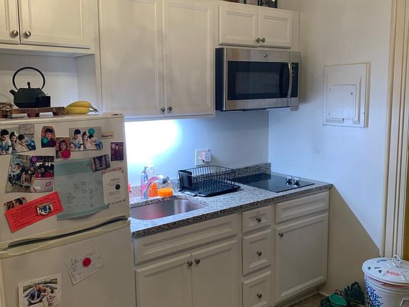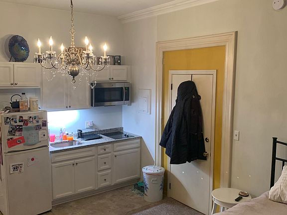 This first floor one room efficiency with a large bay window is small but is in a great location at 401 S. Church St and has loads of Victorian charm including a chandelier in a bronze plaster medallion, faux fire place, six large windows and a porch just outside your front door. It is located at the corner of Church and Dean Streets in the historical district of the borough two blocks from the college, three from downtown. It is heated and cooled with a high efficiency split unit heat pump/AC. Also has new wall to wall carpet. The off street permit parking is excellent. There is a full kitchen with a granite countertop. A washer and dryer are located in the basement. It is available 1 Dec . Rent is $1190, security deposit ($1190)and last month's rent ($1190) are required up front. Owner pays hot and cold water, trash removal, snow removal.