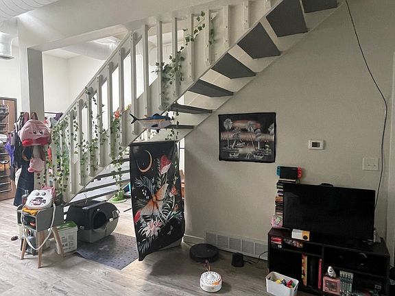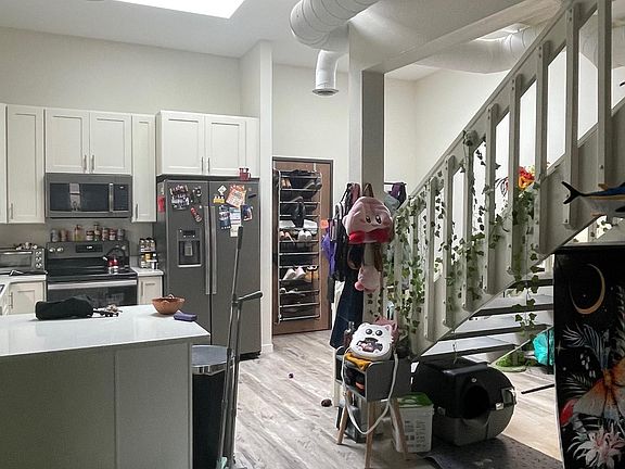 Great design in this 3BR/2BA apartment with beautiful sky lights and fully equipped updated kitchen. Open concept kitchen and living room, one bathroom on the first floor. This unit has three bedrooms, one of which features a lofted space with ladder. The third bedroom can be found up it's private set of stairs to the second floor with a bathroom. Come take a look at this modern unit just a block from downtown! Off street parking is available behind building. Next door to Sanctuary Pub, City Liquor, Sams and Falbo Pizza. Tenants pay all utilities.