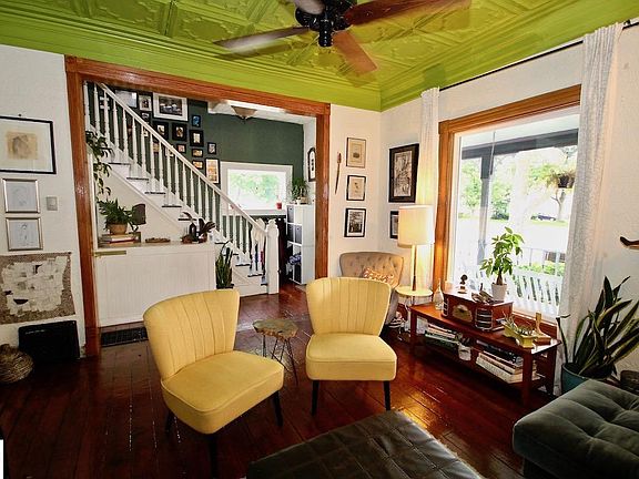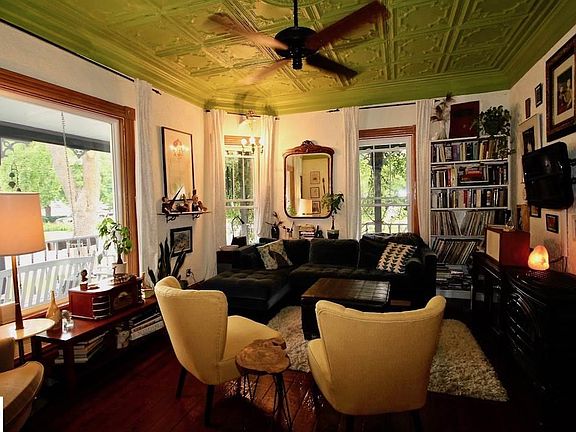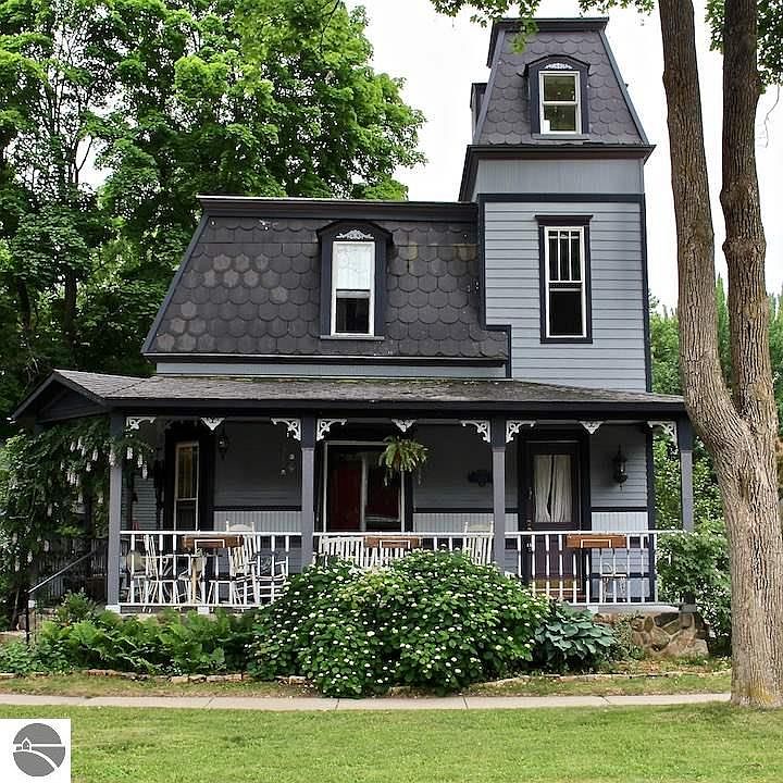 Character filled historical Victorian in quiet neighborhood located in downtown Mt Pleasant. Beautiful , unique features like spacious high ceilings with original tin, functional turret with spiral staircase, original wide - plank wood floors and charming wrap-around porch. Updates include new furnace, roof over kitchen and garage , cement board siding and window trims. Freshly painted exterior. 3-4 bedroom, 2 story. Cement board siding on 3 sides. . Lots of charms. Bath on each floor.Corner lot. Storage in basement. Can walk to CMU, downtown, parks, you name it. A must see! 4th bedroom is being used as a library and does not have a closet.