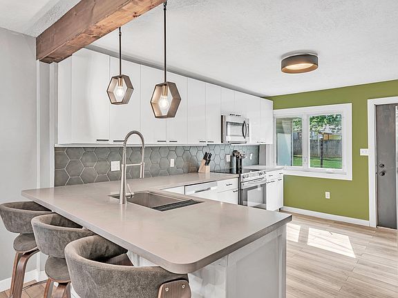 Welcome to this beautifully renovated and modernized 2-bedroom, 1.5-bathroom home located on a quaint street. As you walk up, you'll be greeted by custom wooden wrapped beams, an adorable front porch, and fresh landscaping. Step right into your inviting new home that seamlessly connects the formal sitting area and the living room, featuring rustic built in shelving and a charming white-brick gas fireplace. Off the formal sitting area, you'll find the dining room adorned with a stylish board and batten accent wall, with access to the attached garage that includes a floor drain, a workshop, and houses the laundry area. The chic, modern kitchen is a culinary delight, boasting a breakfast bar, hard surface countertops, an undermount single basin sink with cutting board and drying rack, stainless steel appliances, and a sleek design overall. The brand-new, sparkling tile shower with a sliding glass door, dual toned rainfall shower head, and gold accents will truly make you drop your jaw. The wooden ceiling in the bathroom along with the rustic accent beams and built-in-shelving truly showcases the meticulous upgrades extending throughout the house. The bedrooms feature sliding barn doors and more custom-designed accent walls, adding a touch of rustic elegance and personalized charm. Enjoy the convenience of a half bathroom located in the primary bedroom, perfect for added privacy and ease. Never run out of space with this hard-to-beat, impressively sized walk in closet. The gold and black lighting choices and new smart core vinyl flooring offer complete luxury to this stunning home. The yard is well-defined with fence posts driven and ready to be finished to any buyer's desires, providing a great space for outdoor activities and customization. Don’t settle for a builder-grade new home when you can own a custom-designed home for a great value. Don't miss the opportunity to make it yours! Ask your agent for a full list of updates.