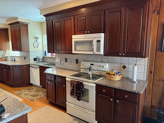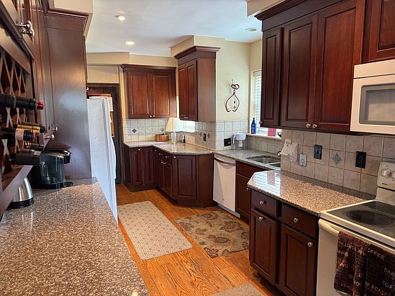 Beautiful Old World charm and character throughout this 4 Bedroom Cape Cod featuring 9 foot ceilings with exposed beams, arched doorways. Stone Fireplace with insert in the Family room. Cozy living room/ den. Kitchen has loads of cabinet space, wine rack and much more. Dining area leads to deck to enjoy this summer! Partial finished basement with room for entertaining. Off street parking and 2 car garage. Corner lot location.