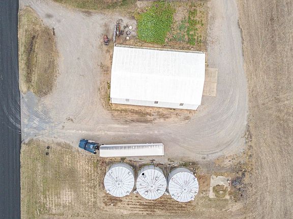 3500 sq ft shop building with concrete floor and electric, 3 grain bins on .82 acre lot