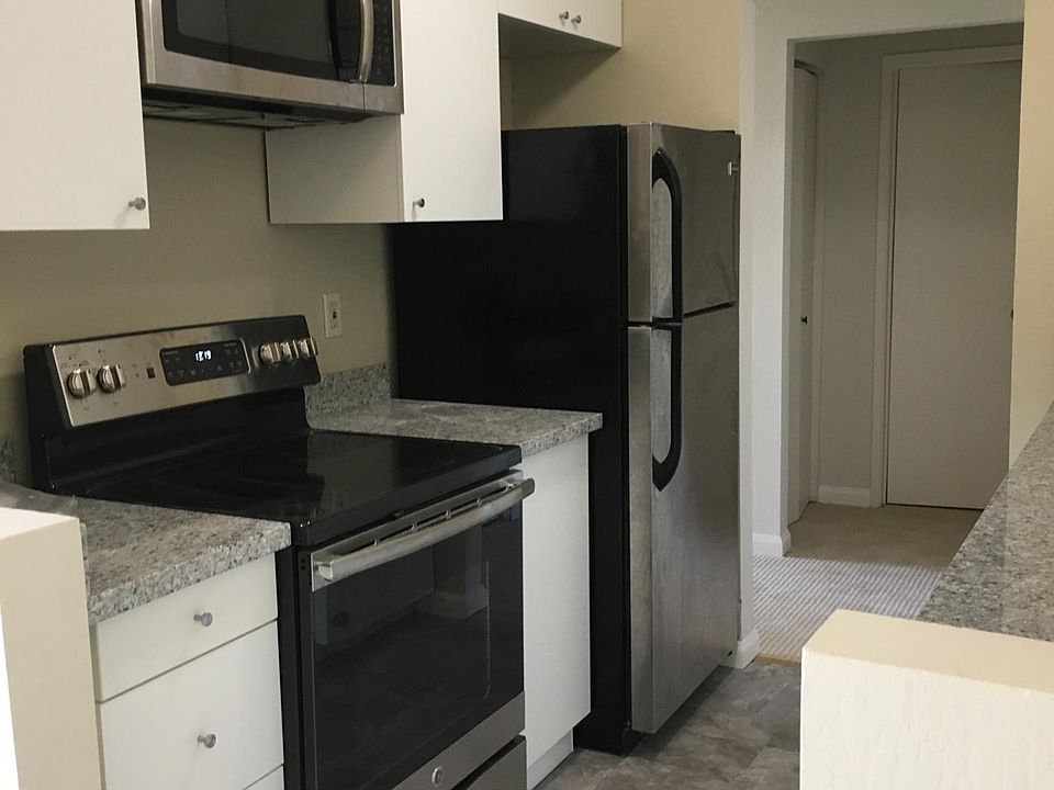 Located in highly-rated Albany school district. 3rd Floor 2 bed/1 bath unit. Nobody above you! Renovated only a year ago - new kitchen with marble countertops and under-mounted sink, new paint, new carpet, new baseboard, new laminate flooring. Great natural light, nice view, and best of all, in an awesome location. Right next to El Cerrito Plaza with Trader Joes, CVS, Barnes and Noble, and Peets Coffee, and all kinds of great restaurants. Located at the end of a court, next to a creek, very quiet and peaceful. One small dog (less than 35 lbs) or one indoor cat allowed for $35/mo pet fee. No increased security deposit. 1 year lease that goes month-to-month after first year. Either a small dog (under 35 lbs) or an indoor cat is a allowed for a pet fee of $35/mo, no increased deposit. Tenant pays gas and electricity. Landlord pays water/sewer and trash. Security deposit equal to one month rent. 1 month rent (prorated if not beginning on first of month) and security deposit due at signing.