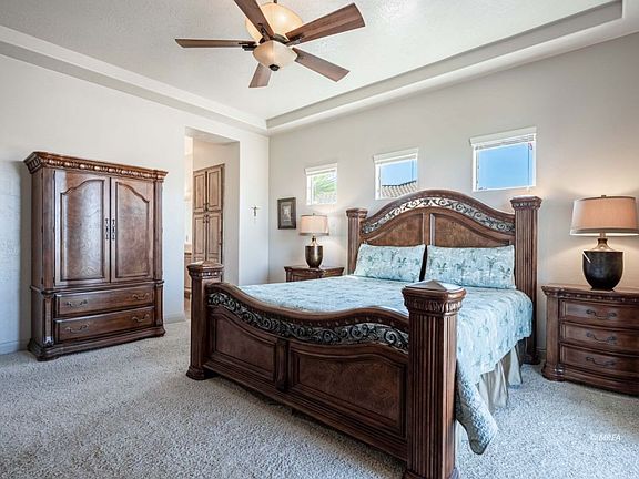 Amazing Location! Home is situated on the outside-corner of an elevated Bluff with Backyard looking to the North-East. Incredible privacy and spectacular Views of Valley and Mountains! This is a 5-Star Energy Efficient Home. Original Owners have always used home seasonally, so it has had very little usage. Open Floor Plan with coffered ceilings. Big Entry that is 14ft. to roof and 8ft tall doors and 10ft.ceilings through-out the Home. Kitchen has beautiful staggered Cabinets with Under Lighting, Granite Counter-tops, Pendant Lights, and Stainless Appliances including Refrigerator. Big walk-in Pantry in the Kitchen! Big Master bedroom has access to the Patio. Master Bathroom has Cultured Marble Surround Shower and jetted Garden Tub. There is a Walk-in Closet in Master Bedroom. The other side of the Home features two nicely sized Bedrooms and the Main Bathroom. Large Utility Room with Washer and Dryer Included! Upgraded Lighting Fixtures and/or Ceiling Fans are in each room throughout the home. 3-Car Garage with 680sq.ft! Water Softener installed. Air Conditioner was replaced in 2018. This is an awesome Desert Retreat!