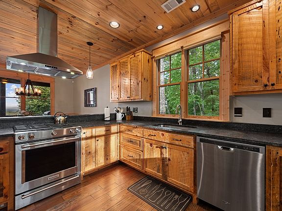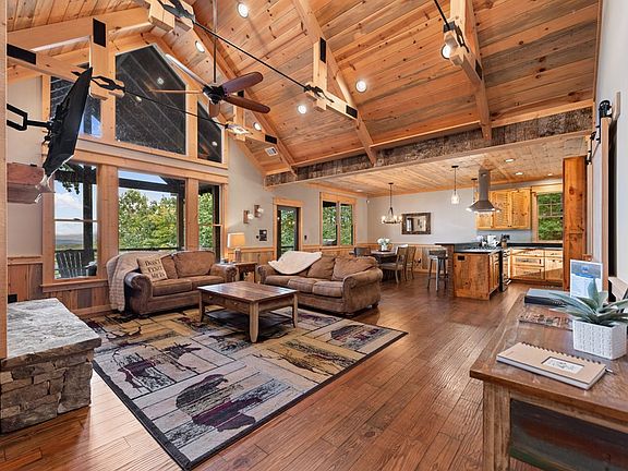 Welcome to Great Escape, a gorgeous custom home where stunning craftsmanship meets year-round, million-dollar mountain views. This three-bedroom, three-bath retreat is clad in Poplar siding with stone accents, and its inviting covered front porch sets the tone for the elegance inside. Step into the open great room with soaring vaulted ceilings, exposed beam work, and striking metal accents. A floor-to-ceiling stone fireplace with gas logs anchors the space, flanked by custom built-ins, while expansive windows frame sweeping views of the North Georgia Mountains. The chef's kitchen is both stylish and functional, featuring hand-scraped wood floors, leathered granite countertops, custom cabinetry, a modern vent hood, and a gas range—perfect for gathering with family and friends. The main level offers a spacious bedroom with vaulted ceilings and a full bath, as well as a laundry closet for convenience. The large primary suite is a true retreat, with porch access, a luxurious bathroom featuring a custom tile shower with three shower heads, double vanities, and an oversized walk-in closet. Outdoor living is exceptional, with a vaulted covered porch complete with a gas fireplace and plenty of room to entertain while taking in the views. The finished terrace level expands the living space with a large great room and another beautiful stone fireplace, a full wet bar with wine cooler, pool table, and two generously sized bedrooms (one doesn't have a closet) that share a full bath. Step outside to the lower-level deck where a hot tub and hammock provide the perfect spot to relax while soaking up the scenery. Located just ten minutes from downtown Blue Ridge with all paved road access, this home combines luxury and convenience in one incredible package. Offered fully furnished, turn key.
