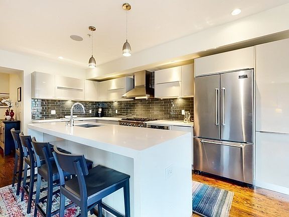 Spacious bright & sunny 2 bed/2 bath corner unit with balcony & 1 garage parking space in elevator building with a sprawling common roof deck with downtown views! This welcoming front facing corner residence features a large open kitchen/dining and living area with oversized windows & a balcony. The custom kitchen cabinetry features ample storage with pantry, stainless steel Viking appliances, glass backsplash and quartz counters with an expansive waterfall edge island. Bedrooms & closet spaces are generously sized throughout the unit including an expansive primary suite with walk-in closet, en-suite bath with double vanity, heated radiant flooring and steam shower. Featuring hardwood floors throughout, NEST thermostat, surround sound and custom window treatments. This professionally managed, impeccably maintained pet-friendly elevator building is conveniently located on the West side with access to the many shops/restaurants, the Seaport District, and easy access to downtown.