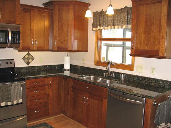Lovely home with large yard-- the equivalent of 3 lots. East lot with 2 stall garage could be sold separately. Beautiful kitchen remodel with SS appliances, granite counters, cherry cabinets with molding on top & bottom, pantry w/ pull-out shelves, slow close drawers, tilt-out sponge holder, touch activated lighted china hutch. 4-seasons sun porch, fireplace on main w/ Stone City stone. Relacement windows throughout. Laundry chute. Newer hot water heater. Non-conforming BR in LL. Metal roofs- house & gar.
