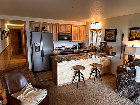 Fully furnished and remodeled with private steam unit in master bath. Unique original artwork but some can be traded out if desired. Truly one of a kind property. Owner is a volunteer ski patroller and will use for part of the season but is OOT this period and flexible after New Years if additional use is desired. Can switch out shelves in bedroom with a twin bed if needed for small family.