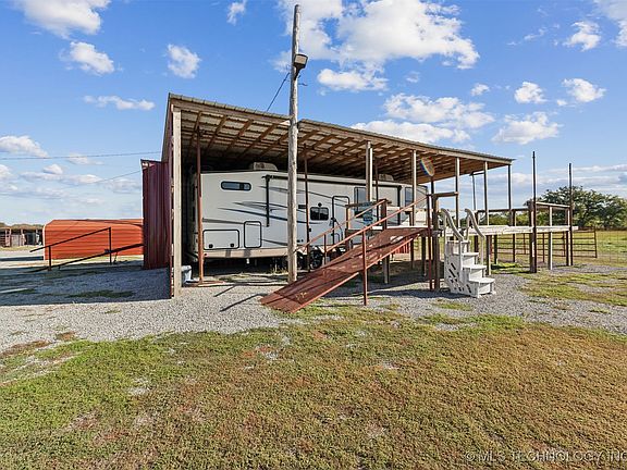 bath manufactured home, multiple outbuildings and RV cover. This property has an excellent set of cattle working corrals and pens as the current owner has used the property to buy and sell cattle during ownership. There is a semi-truck turnaround with semi truck loading and unloading capabilities and multiple sorting pens to rest cattle or you could use for calving cows or heifers. The property could also be developed into residential housing lots or even an RV Park since it is located right on HWY 28 and one mile west of HWY 69 having alot of Grand Lake and Lake Hudson traffic. The possibilities are endless with this property to use in its current state or turn it into a commercial business location.