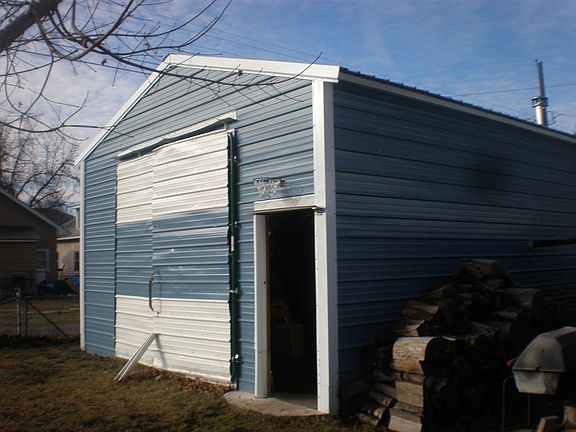 Metal roof, steel siding, on fenced corner lot. Has 20 x 20 heated shop as well as 2 car, detached garage. Has large, second bedroom up stairs and master on the main floor.
