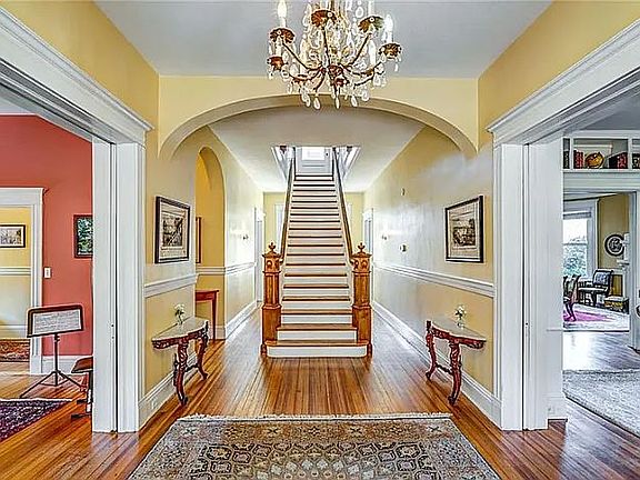 RARE OPPORTUNITY TO OWN HERMITAGE ROAD HISTORIC HOME. From the grand circular driveway, columned wrap around porch, side porte-cochere with sleeping porch above, to the park like acre plus private back yard, this grand mansion is pure turn of the century charm. Built in 1909, this impressive 5 bdrm home features a gorgeous entry hall with floating staircase, 8 fireplaces, 4 converted to gas and working. 1st floor has two formal parlors with pocket doors, one with built in bookcases, a large dining room and family room, stunning kitchen remodel was done in 2009 to include radiant heat flooring, granite counters, stainless appliances, built in wine storage, butler pantry and half bath. 2nd floor features three bedrooms, large hall bath with soaking tub and separate shower, gorgeous sunlit sleeping porch, and a beautiful owner suite with custom walk in closet, separate his and her full baths and laundry. 3rd floor features another large bedroom with huge walk in closet, storage room, bright window seating and ample play area for kids. There is also a full basement with laundry, half bath and access door to back yard.
