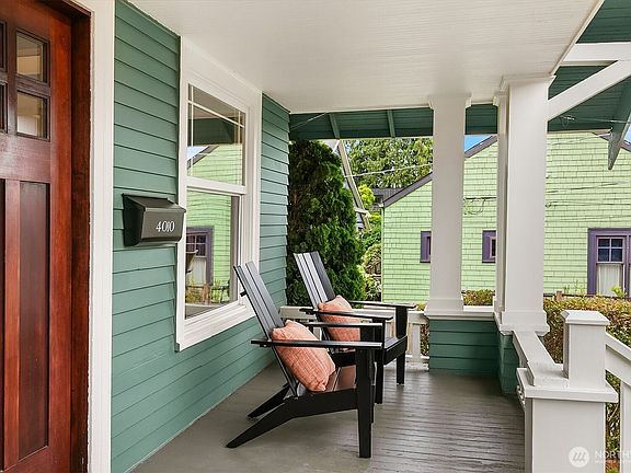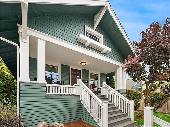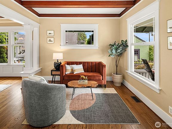 Wake up to morning light dancing across box beam ceilings, pour your coffee, and settle onto the classic rocking chair front porch as the neighborhood stirs to life. This Wallingford Craftsman is equal parts charm and comfort where meals are shared in the formal dining room, weekend brunches linger in the sunny breakfast nook, and evenings unfold on the new back deck. Inside classic features such as warm oak floors, wainscoting, and a clawfoot tub meet modern upgrades like central AC and solar panels. The spacious primary suite includes a walk-in closet and full bath. Flexible lower-level spaces offer a media room and ideal work-from-home setup. With a Walk Score of 95, you're moments from restaurants, cafés, and the Burke-Gilman Trail.