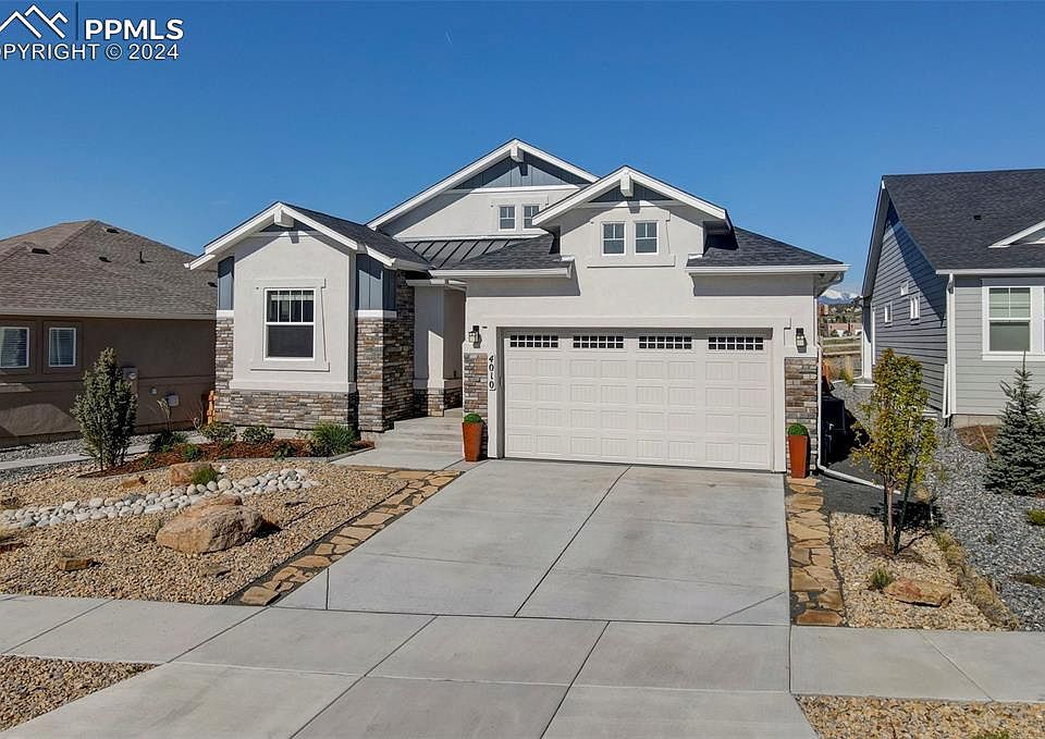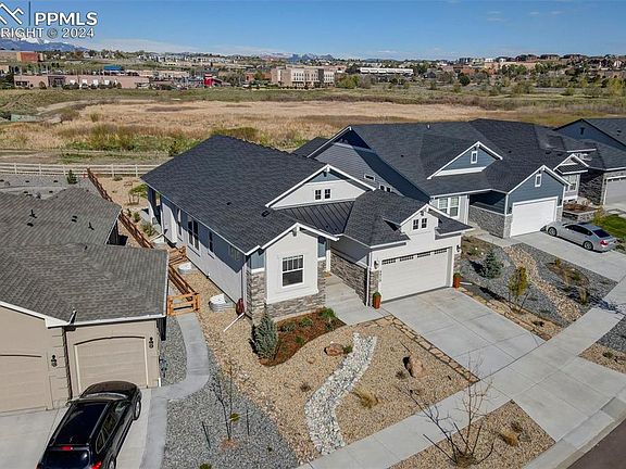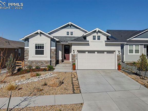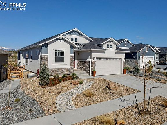 Step into a nearly new, impeccably designed ranch-style home built in 2022 by Classic Homes, located to maximize the stunning, unobstructed views of Pikes Peak. This elegant residence is equipped with a gourmet kitchen featuring granite countertops, a farmhouse sink, and upgraded stainless steel appliances, including an induction cooktop and a sleek stainless steel hood vent. Throughout the main level, luxury vinyl plank flooring offers both durability and modern aesthetics, making it ideal for families with pets and children. The home boasts a finished basement that enhances its spacious feel, with 9 ft ceilings and two large bedrooms each featuring walk-in closets. It is also plumbed for a wet bar, adding potential for additional customization. For those who love outdoor living, the property features a covered and extended back patio that leads to a beautifully landscaped backyard. This outdoor space backs onto open areas, ensuring privacy and providing a perfect backdrop for relaxation or entertaining. The primary suite of this exquisite home is a true sanctuary, designed to maximize comfort and luxury. As you enter the suite, you are immediately greeted by breathtaking views of the mountain through expansive windows that not only illuminate the space with natural light but also offer a tranquil backdrop ideal for relaxation. The suite includes a lavish bathroom, featuring a deep soaking tub and a separate private shower, perfect for unwinding after a long day. Elegant fixtures and finishes enhance the serene atmosphere of the bath area. Adjacent to the bathroom, a spacious closet offers ample storage and is thoughtfully designed with direct access to the laundry room, enhancing convenience and functionality. This residence offers a blend of luxury, practicality, and stunning natural beauty, making it an ideal choice for those seeking a sophisticated yet comfortable lifestyle. Whether you’re entertaining guests or enjoying a quiet evening, this home has it all!