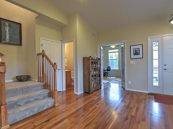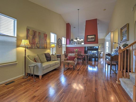 Open the door to this sun-drenched home with beautiful cherry hardwood floors throughout the main floor! Step through the main floor living areas with soaring vaulted ceilings into the roomy kitchen and great room with stainless appliances and a large island. The new granite makes this kitchen sparkle! You will be drawn outside to the gorgeous flagstone and stamped concrete patio. You'll love the panoramic mountain view, acres of open space, and close proximity to the Paul Derda Recreation Center, lake, and trails just steps away. Enjoy the lovely gardens with tons of beautiful flowers. Main floor study, large laundry room, great room wired for surround sound, and en suite baths in all bedrooms, this one has it all!