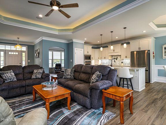 Breathtaking 2022-built waterfront home in the highly desirable Carolina Colours community. This one-story, three-bedroom, two-bath home offers elegant lake views, top-notch finishes, and a seamless layout. Enter inside to an open-concept living area featuring luxury vinyl plank flooring, tall baseboards, crown molding, and a cozy fireplace with custom built-ins. A trey ceiling with inlaid lighting enhances the space's warm, inviting ambiance. The kitchen, ideal for both cooking and gathering, includes a large island with bar seating, stainless steel appliances, a wall oven, and a Reverse Osmosis water filter at the sink. Nearby, the dining area also features a lit trey ceiling, creating a perfect setting for memorable meals. The living room opens to an enclosed patio with stamped concrete flooring, where you can relax and enjoy beautiful water views. Elegant arched openings and high-end touches like inlaid lighting and crown molding are found throughout the home, including the versatile flex room that could be a family room or office. The primary suite offers a spacious walk-in closet, trey ceiling, and a luxurious en suite bath with dual sinks and a walk-in shower. Two additional bedrooms provide comfortable guest accommodations, while the mudroom and laundry area connect to a fully heated and cooled two-car garage with an additional sink. Thoughtful extras like built-in speakers, a whole-home generator, and abundant attic storage enhance convenience and luxury. The large attic space is roughed in for a bathroom and could easily become a 4th bedroom. HOA dues include fiber optic cable and internet, ideal for those working from home. As part of Carolina Colours, residents enjoy access to golf, fishing ponds, walking trails, a fitness center, pool, and restaurant. Just minutes from historic downtown New Bern, this home is a rare gem where lakefront tranquility meets modern elegance—don't miss the chance to make it yours! Contact us today for your private showing!